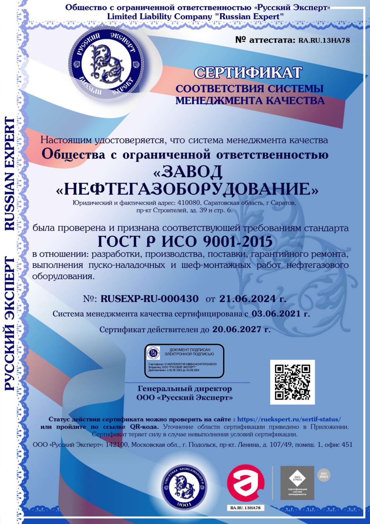 Современные производственные процессы, система менеджмента качества (сертификат ГОСТ Р ИСО 9001-2008) обеспечивают надежность производимого оборудования, положительно зарекомендовавшего себя на объектах ПАО «Газпром» и других крупных предприятий России и стран СНГ. В компании приняты новейшие производственные стандарты, обеспечивающие неизменно отличное качество производимой продукции. Мы постоянно модифицируем изготавливаемое оборудование, следим за появляющимися технологическими новинками и новыми исследованиями, имеем широкое поле контактов во всем мировом нефтегазовом сообществе.